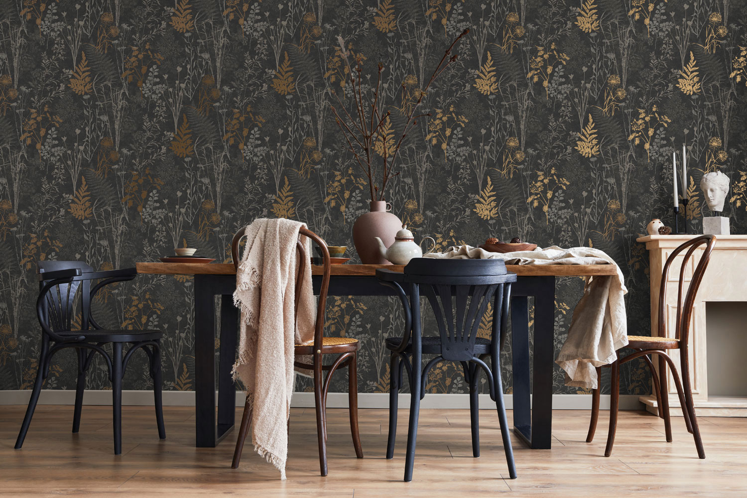 This black wallpaper with floral and leaf motifs brings a dramatic and modern look to any room. Perfect for stylish and bold designs.