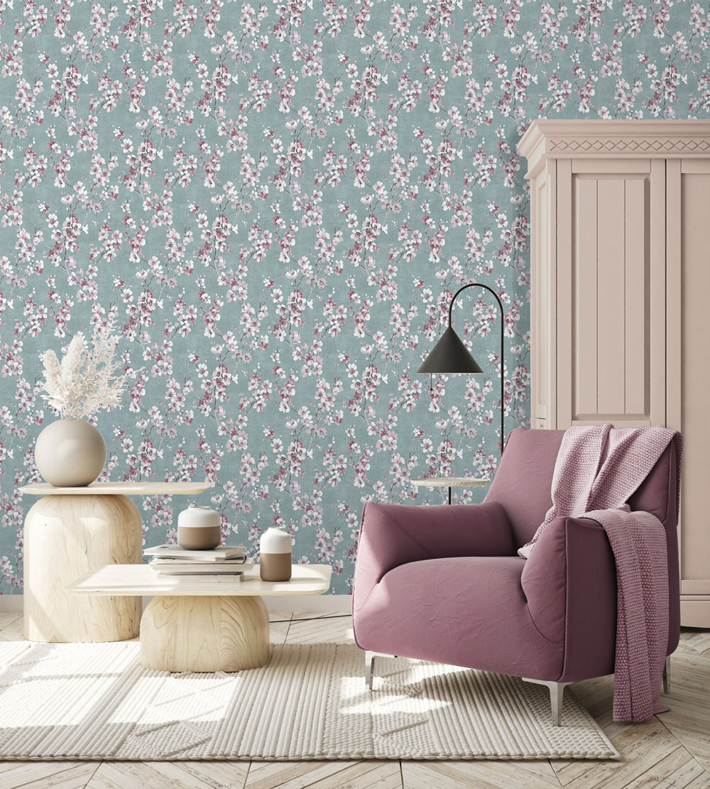 This blue wallpaper with a floral pattern brings freshness and liveliness to any room. Ideal for living rooms and dining rooms.