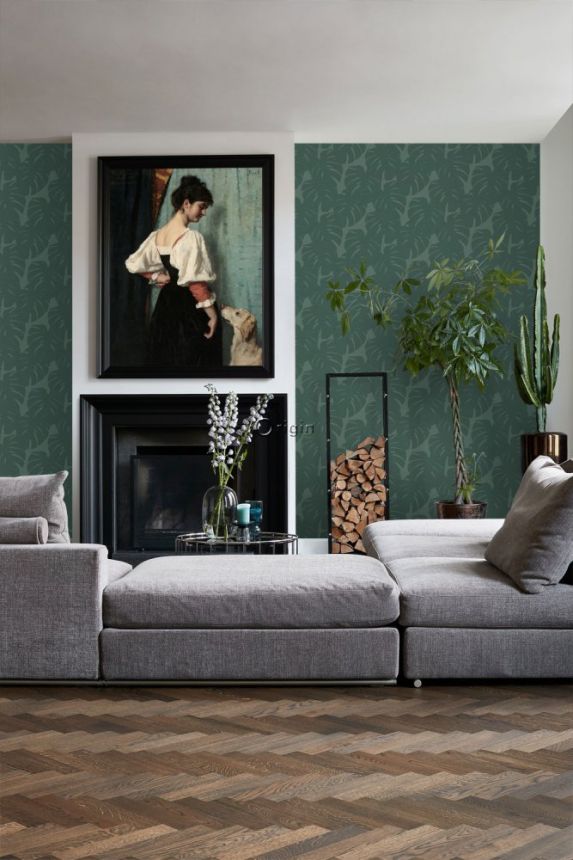 Non-woven green wallpaper - monstera leaves - fabric texture 347762, Natural Fabrics, Origin Non-woven green wallpaper - monstera leaves - fabric texture 347762, Natural Fabrics, Origin