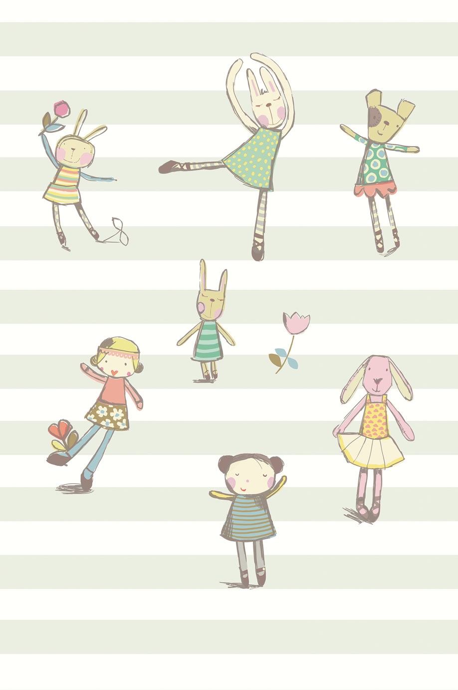 Animal ballerinas on a gray and white striped background - a cheerful wall mural for the smallest children.