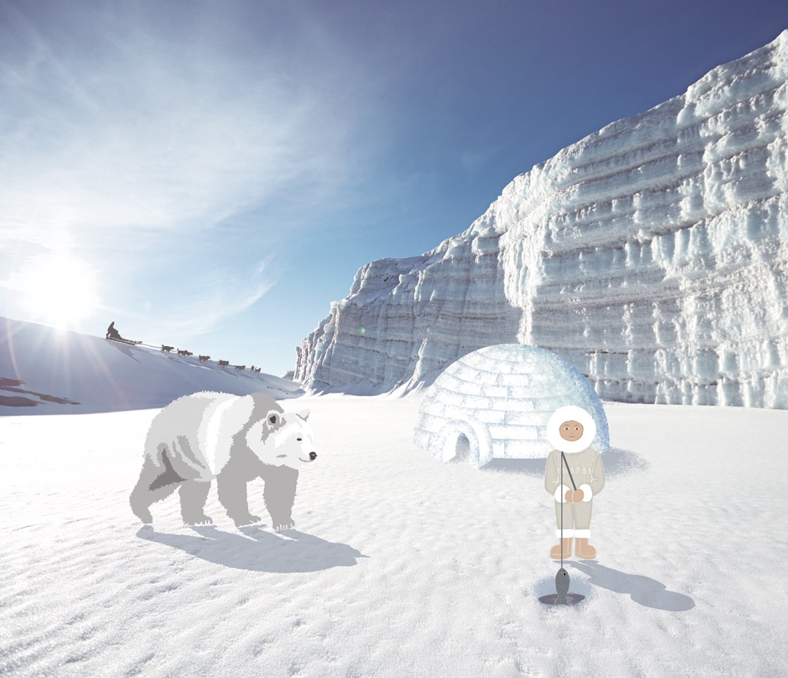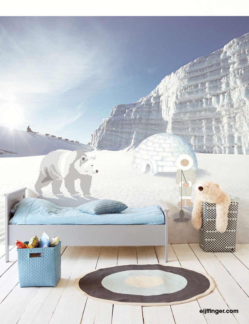 Eskimo, igloos, polar bear, glacier in the background. Wall mural for little adventurers.