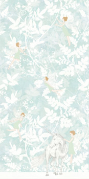 Unicorn with fairies on a gentle blue and white wall mural with nature motifs.
