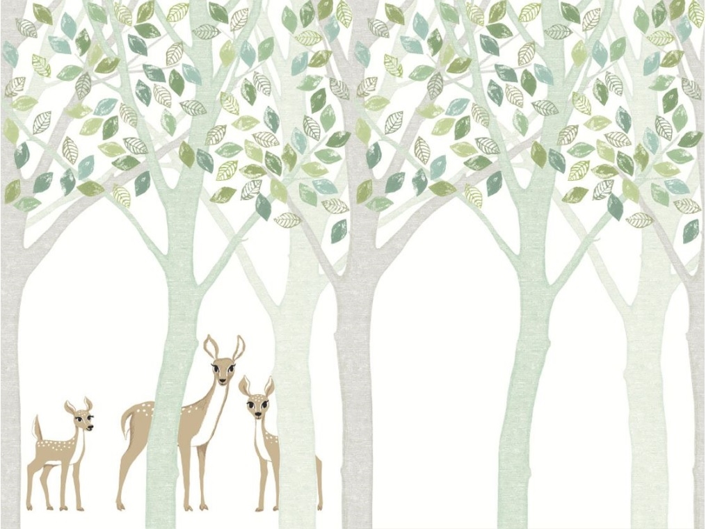 Gentle trees in grey and green, deer in the background. You can easily decorate this wallpaper with animal stickers.