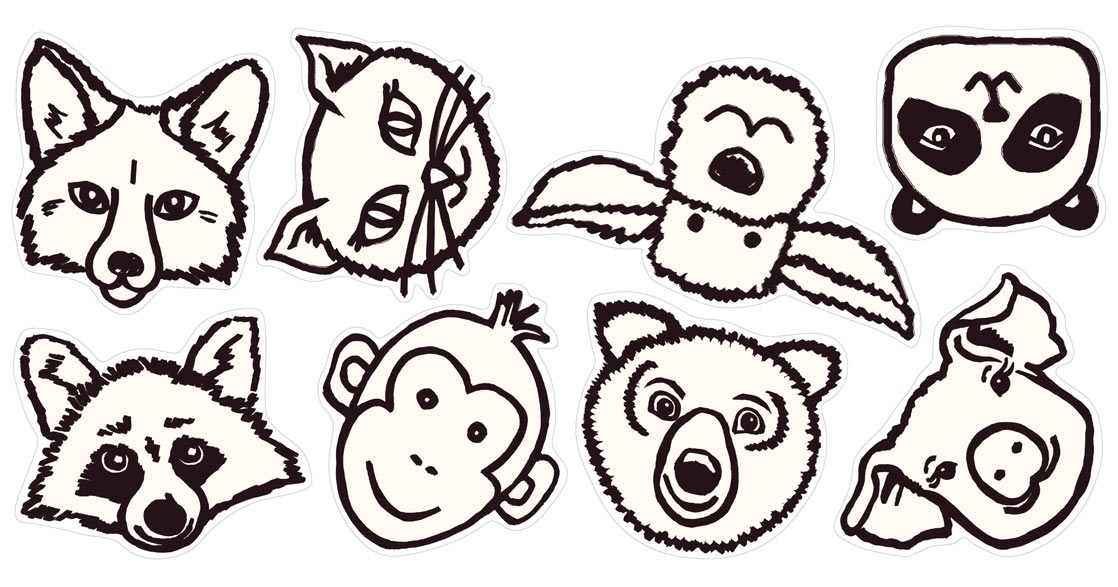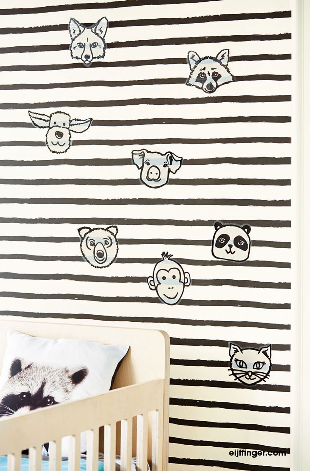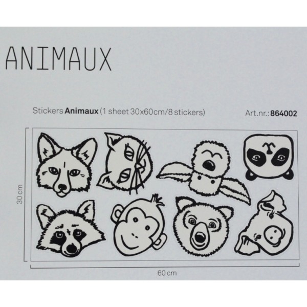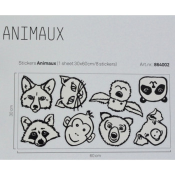 6 pcs of stickerrs of happy animals, which you can use separately on the wall or on finely striped wallpaper.