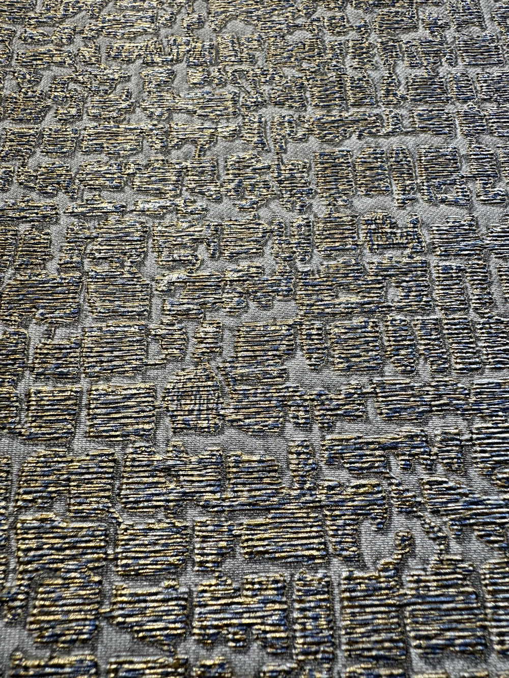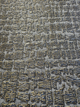 Modern, impressive non-woven wallpaper with an unusual design - the background imitates a fine grey semi-gloss fabric, wallpaper texture created by blue and gold metallic "fibers".
