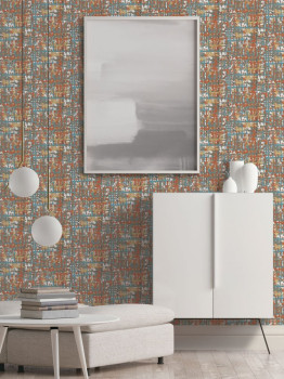 Modern, impressive non-woven wallpaper with an unusual design - background of fine gray fabric, pattern created by metallic "fibers" in shades of gray, orange, blue and yellow.