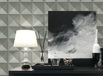 Non-woven, metallic gray-brown-silver wallpaper.