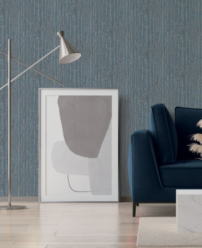 Non-woven wallpaper - a silk fabric design with a soft semi-gloss with a metallic embossed textures in metallic blue and silver shades.