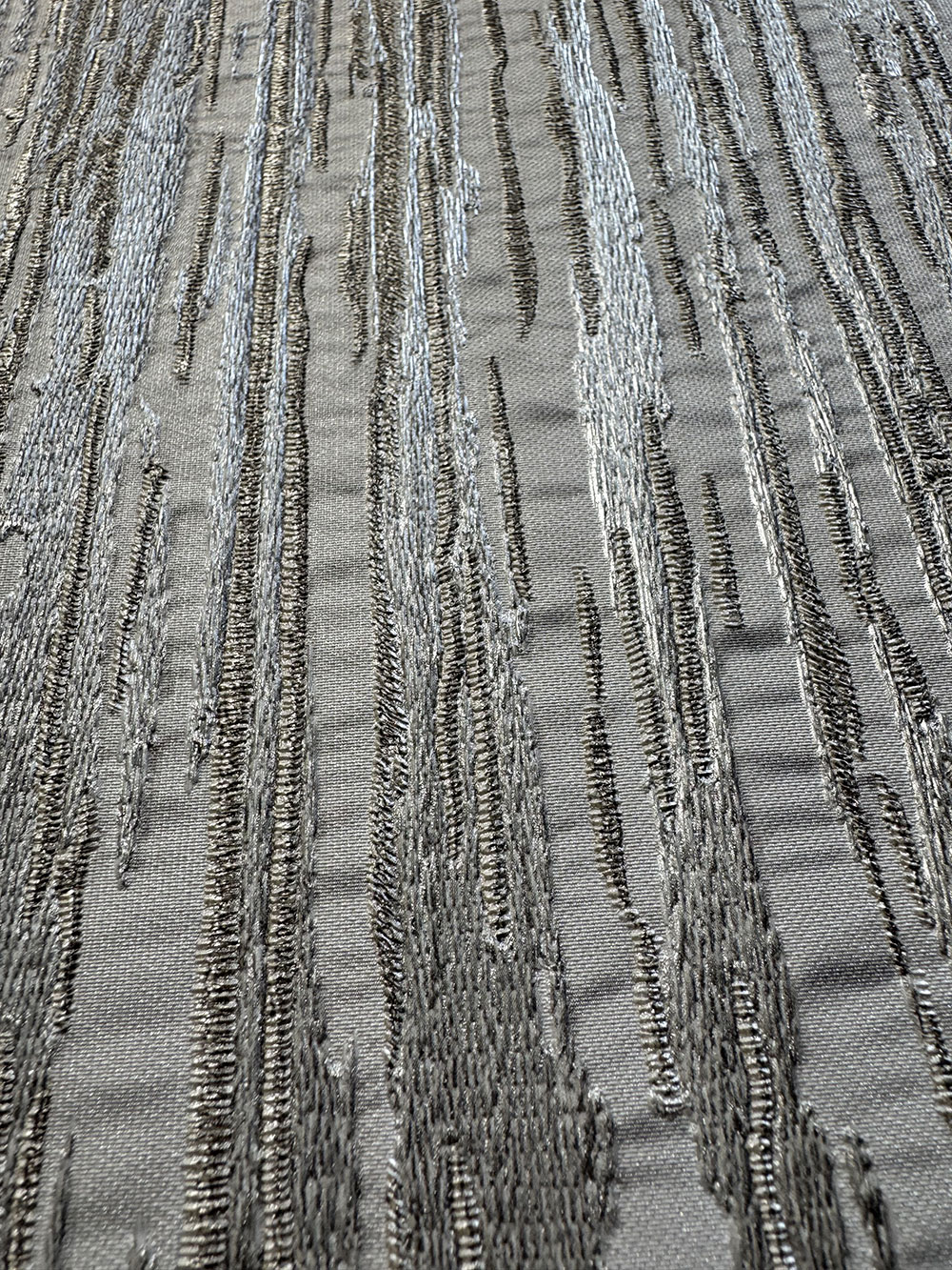 Luxury non-woven wallpaper with vinyl surface - silk fabric design with a soft semi-gloss with metallic embossed textures in shades of grey-silver. The colours and reflections on the wallpaper change according to the impact of the light.