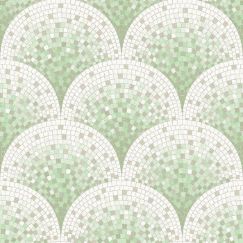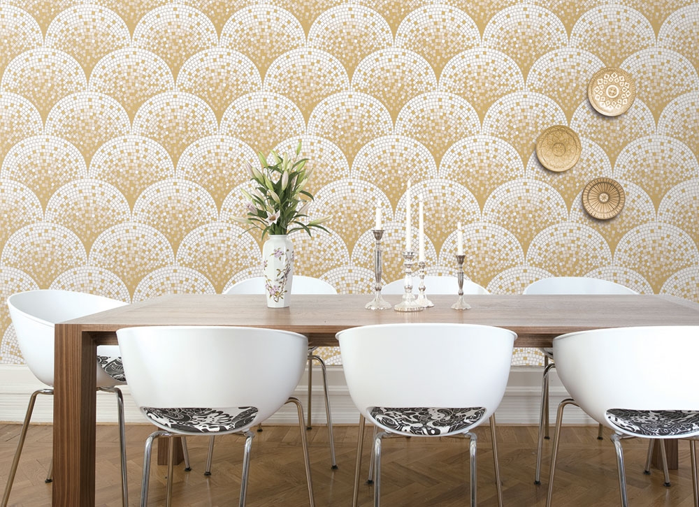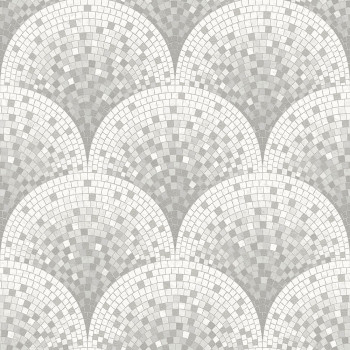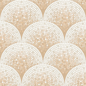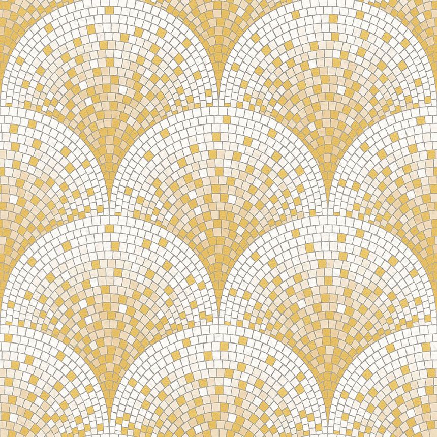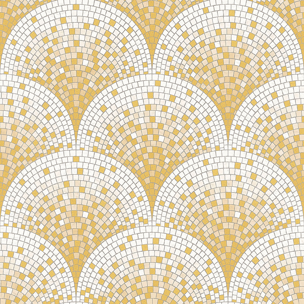 Non-woven wallpaper in shades of white, beige and gold, embossed mosaic design.