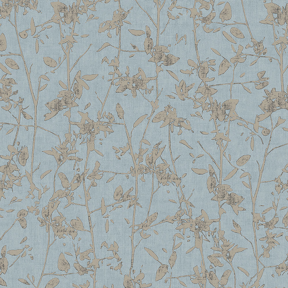 Non-woven wallpaper with the motif of golden twigs and leaves on a blue wallpaper.