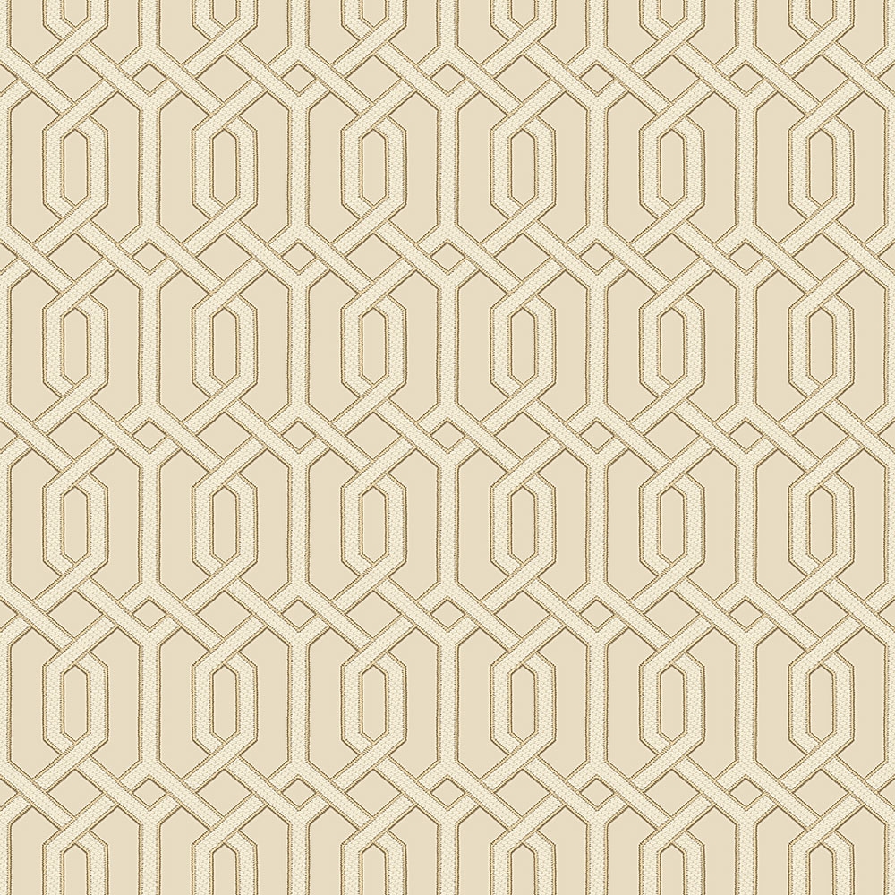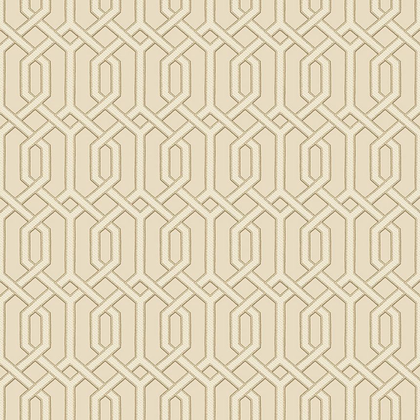 Non-woven, semi-gloss beige wallpaper with a fine texture, finely structured pattern with gold metallic outlines.