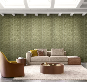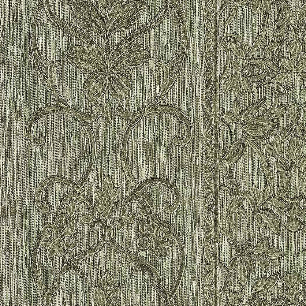 Roll width 0.7m Luxury non-woven wallpaper with a vinyl surface, distinctly embossed texture, background in shades of metallic green, gold and bronze. Colors and reflections change according to the light incidence. Easily combinable with related designs.
