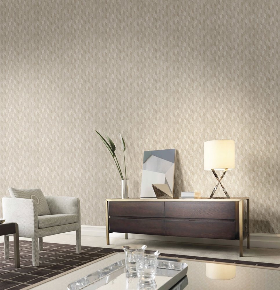 Luxury non-woven wallpaper with a vinyl surface, distinctly embossed texture creates a geometric pattern, gray-beige with silvery semi-gloss.