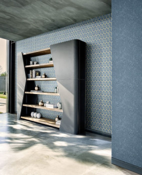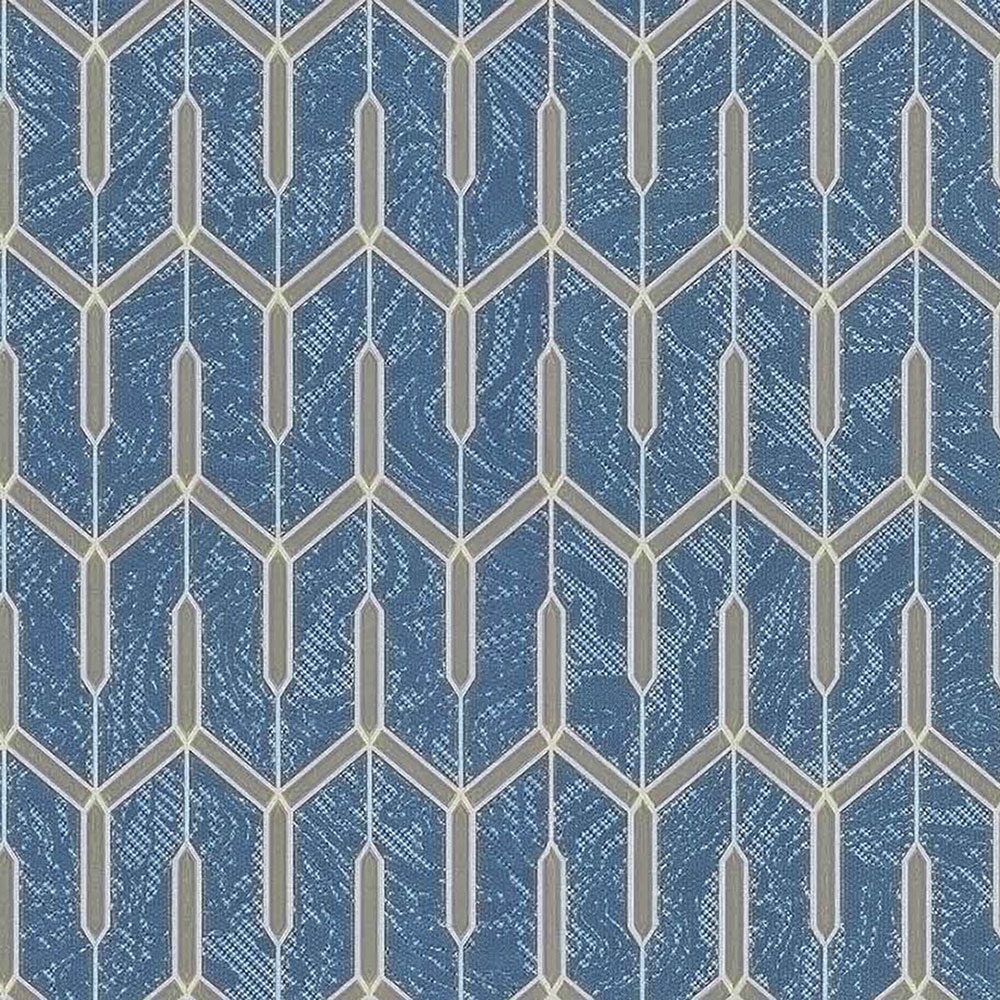 Roll width 0.7m. With this collection, you will bring uniqueness and elegance into your interior. Luxury non-woven wallpaper with a vinyl surface, design and texture of carbon fibers, hexagons pattern, effective matte and semi-gloss changing. Shades of metallic blue, gray-silver pattern, beige joints with a gentle metallic gloss. Easily combinable with related designs.