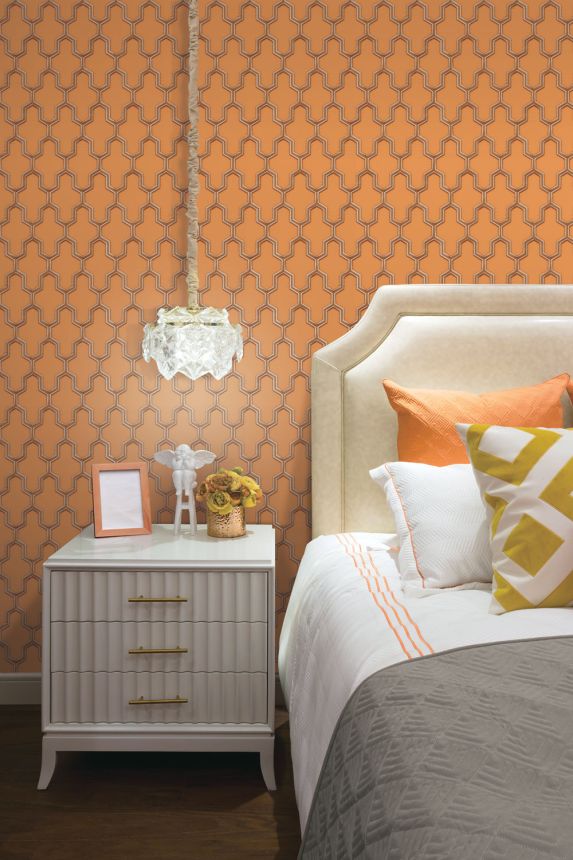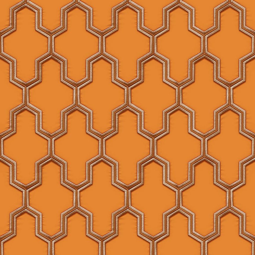 Brown-beige embroidered pattern in Art Deco style on a non-woven wallpaper with an orange background.
