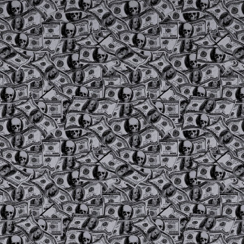 Luxury non-woven wall mural with the motif of dollar bills and skulls on a structured background.