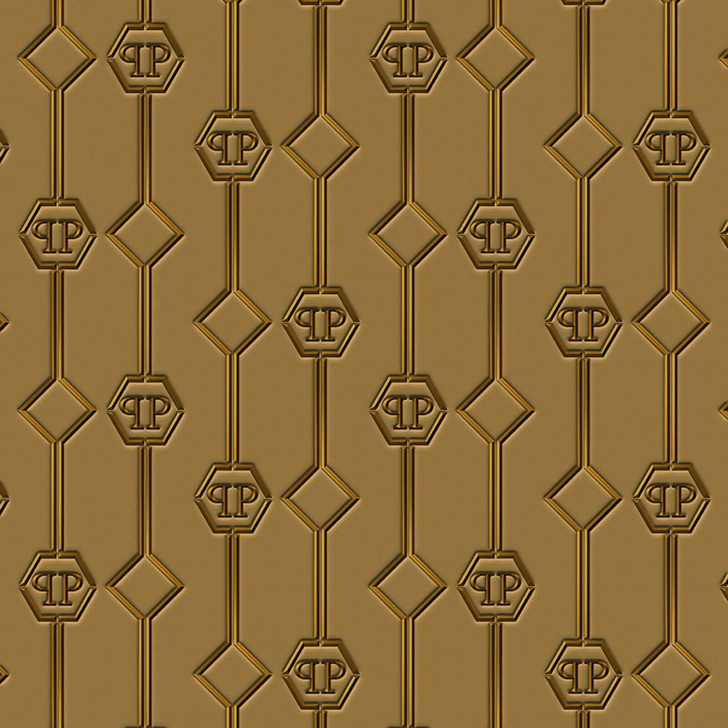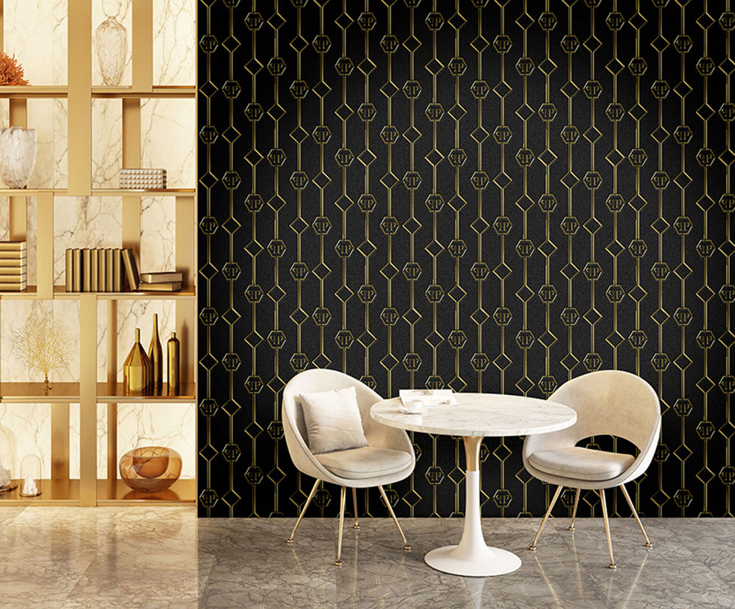 Luxury gold non-woven wall mural with golden geometric pattern and PP logos.