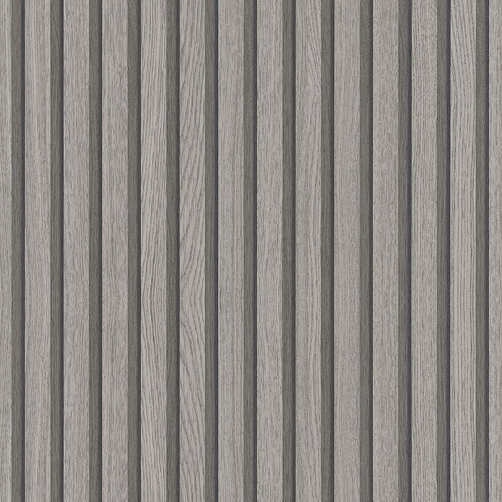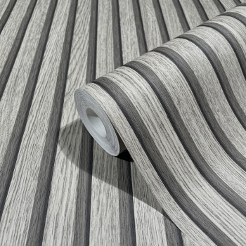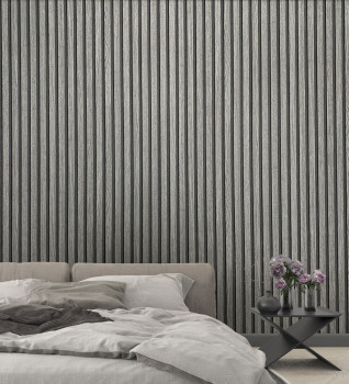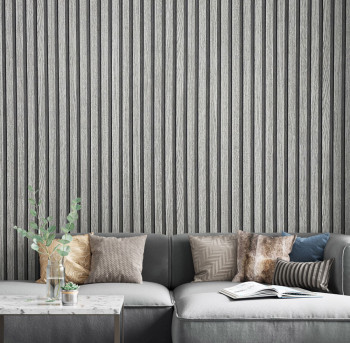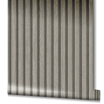 Gray-brown 3D non-woven wallpaper with wood imitation.