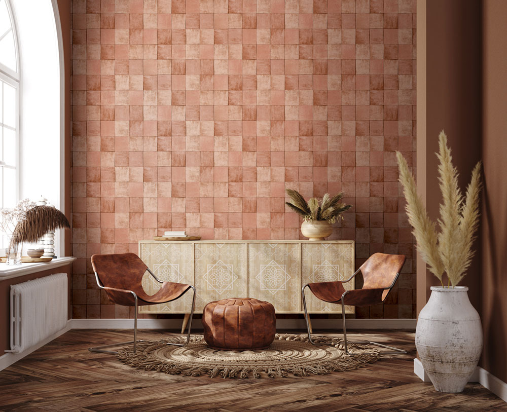 Luxury coarse textured non-woven wallpaper with a vinyl surface with beige-antique pink tile decor. Tile size approx. 10.5x10.5cm.