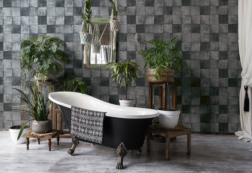 Luxury coarse textured non-woven wallpaper with a vinyl surface with light gray blue tile decor. Tile size approx. 10.5x10.5cm.