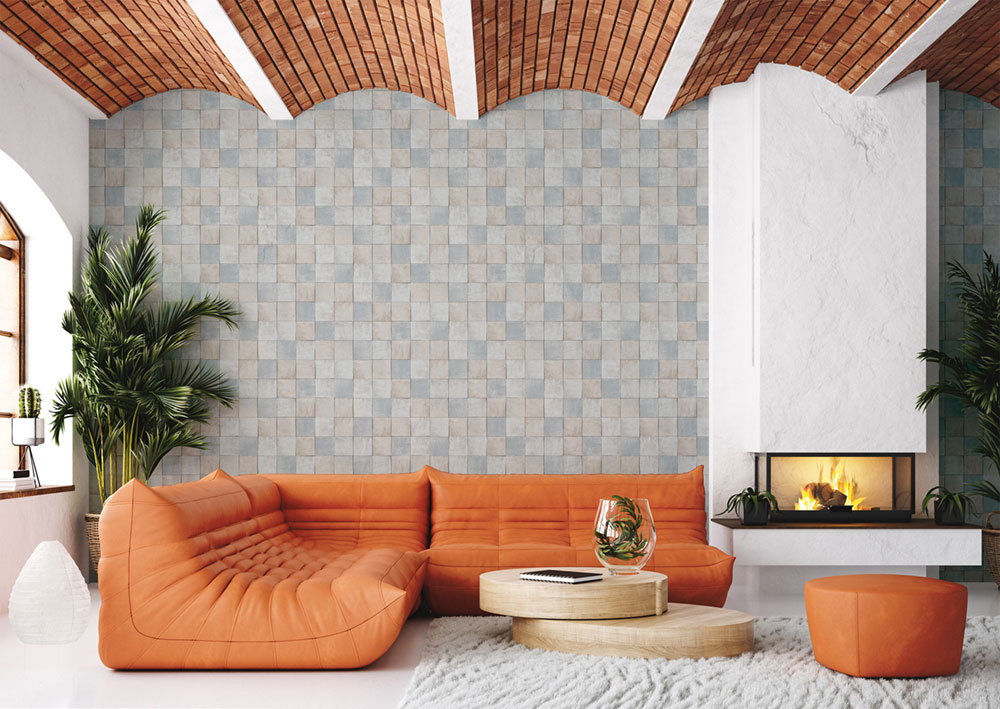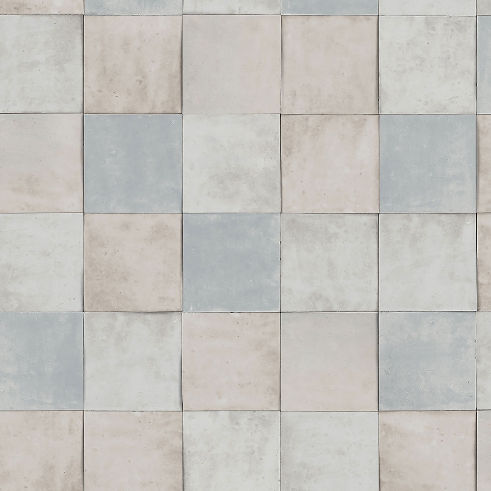 Luxury coarse textured non-woven wallpaper with a vinyl surface with light gray-blue tile decor. Tile size approx. 10.5x10.5cm.