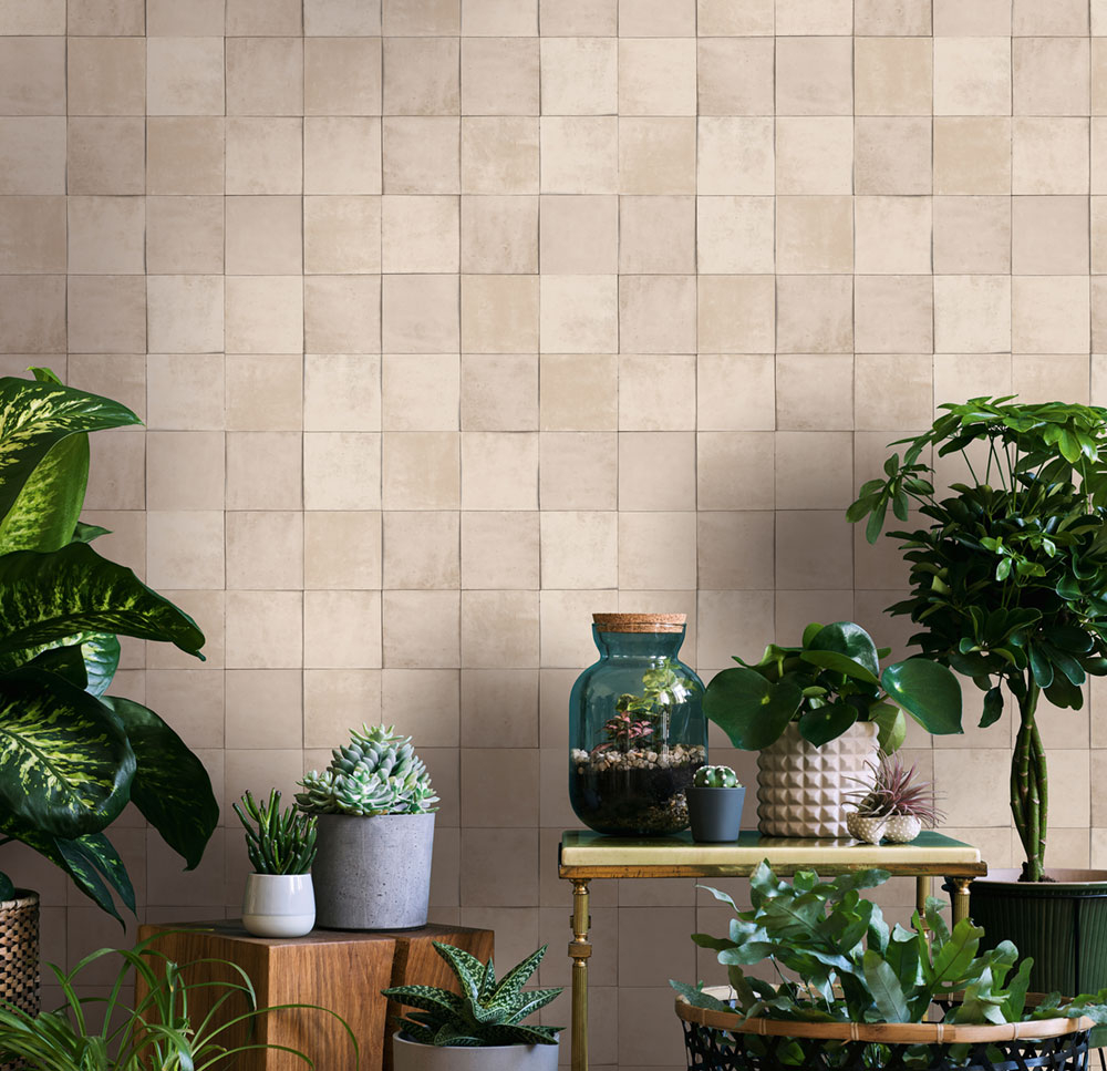 Luxury coarse textured non-woven wallpaper with a vinyl surface with beige tile decor. Tile size approx. 10.5x10.5cm.