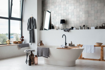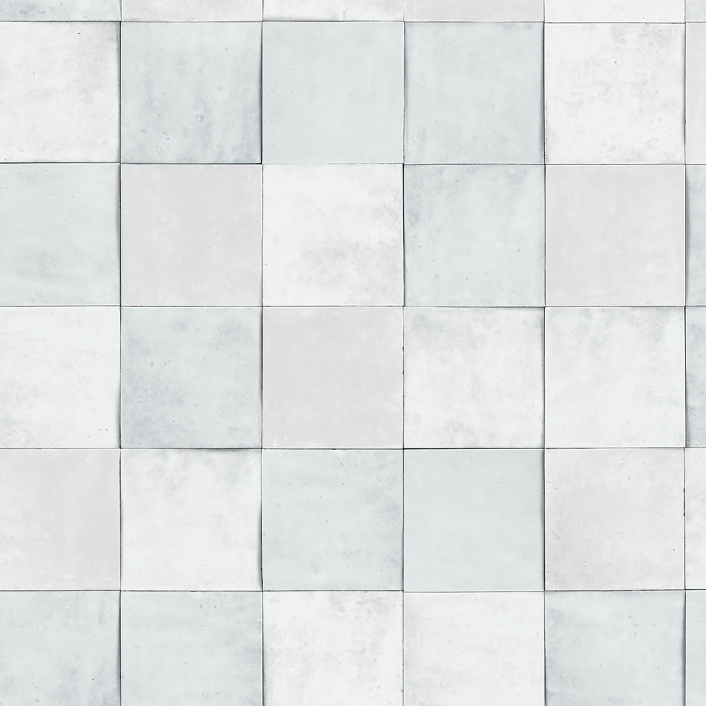 Luxury coarse textured non-woven wallpaper with a vinyl surface with light gray tile decor. Tile size approx. 10.5x10.5cm.