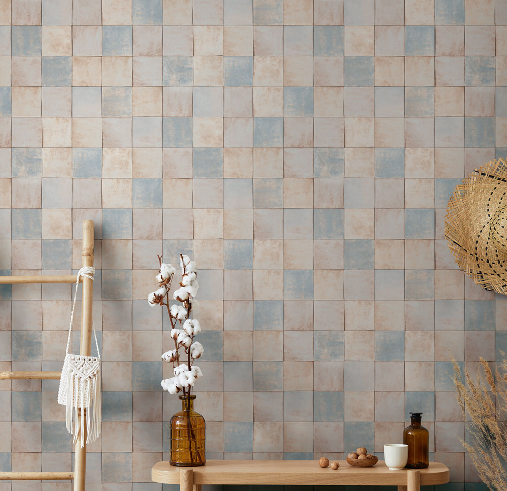Luxury coarse textured non-woven wallpaper with a vinyl surface with light brown-blue tile decor. Tile size approx. 10.5x10.5cm.