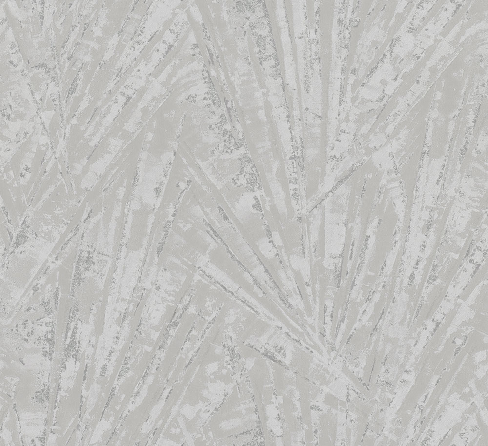 Grey non-woven wallpaper with vinyl surface inspired by a palm leaf, which is particularly interesting due to the contrast of fine metallic lines on a matt background.