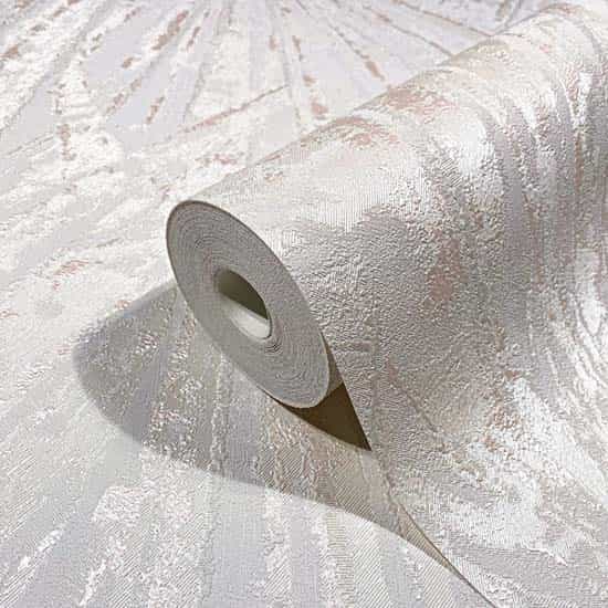 Creamy non-wovenwallpaper with a vinyl surface and old pink details inspired by a palm leaf, which is particularly interesting due to the contrast of fine metallic lines on a matt background.
