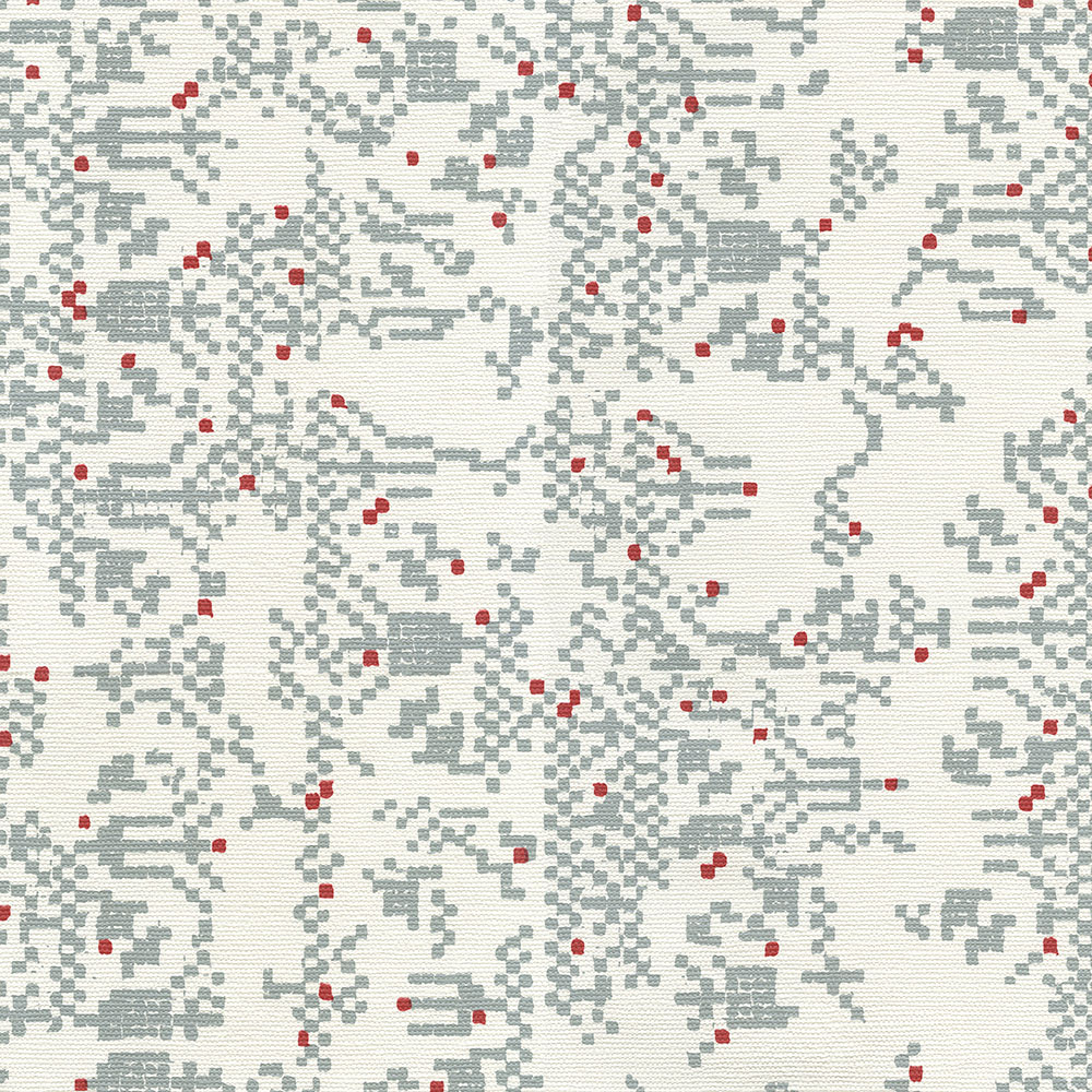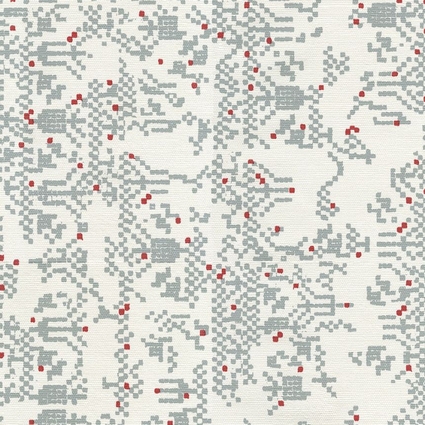 Unusual gray geometric pattern with red details on a white background. Non-woven wallpaper with a vinyl surface.