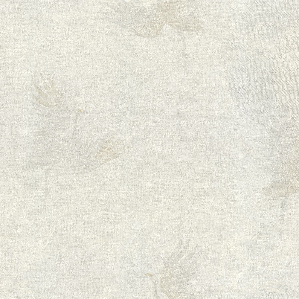 White-grey non-woven wallpaper with a vinyl surface, bird motif, coarse fabric texture.