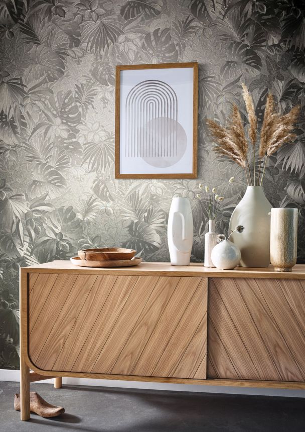 Luxury non-woven wallpaper with vinyl surface, pattern with leaves, metallic gloss.