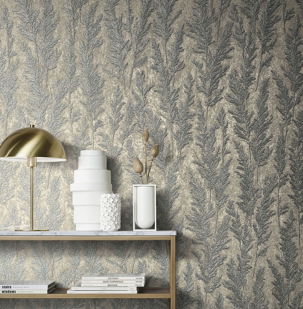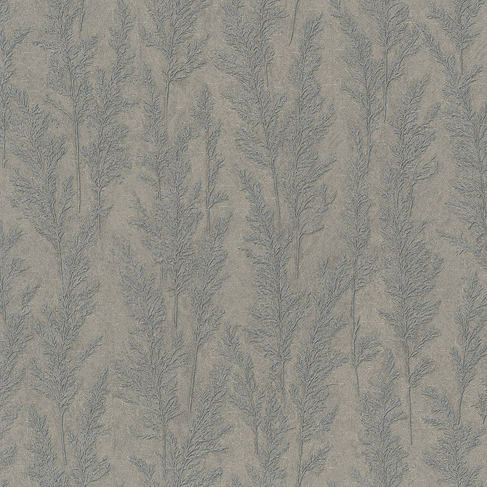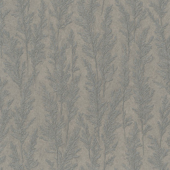 Gray non-woven wallpaper, metallic effects, gray-blue grass blades.