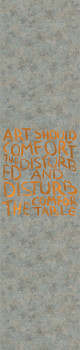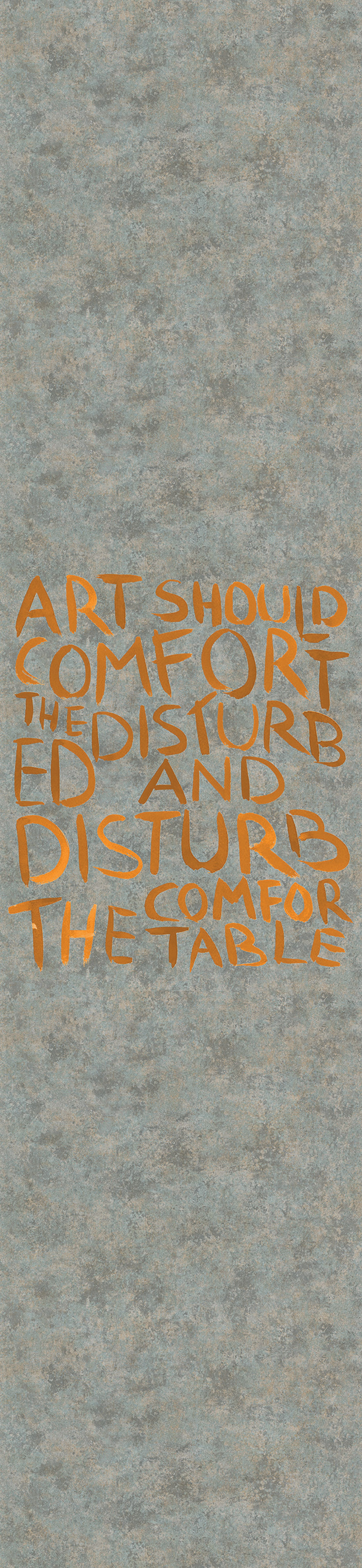 Luxury non-woven wall mural with a vinyl surface, metallic green-grey-beige background with orange lettering.