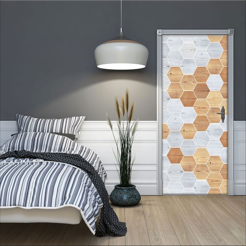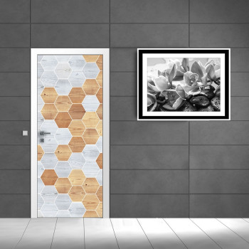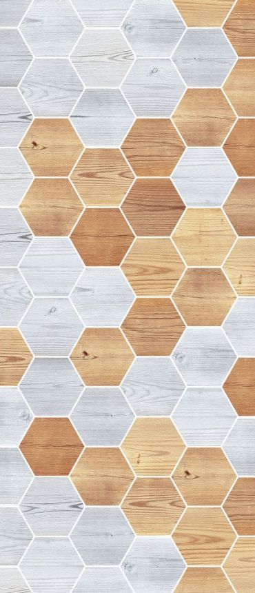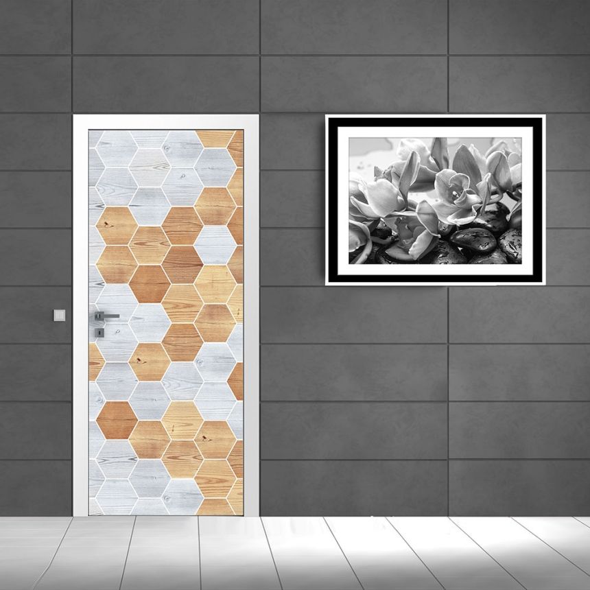 Non-traditional hexagons motif in a wood design. One-piece non woven mural wallpaper not only for door.