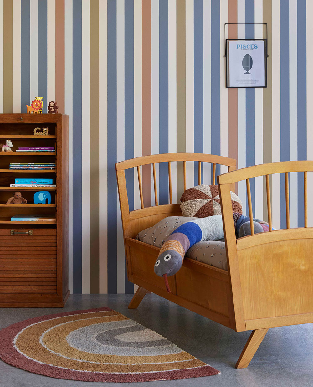 Children's non-woven wallpapers from the new Explore collection from the Dutch wallpaper manufacturer Eijffinger will create a wonderful world full of adventure for children in their rooms. Step by step, you discover the world. An abundance of shapes, textures, colours and scents.… Sail off on an adventure in a hand-drawn boat. A shoal of curious fishes glides beneath the waves. Snippets of paper in all sorts of shapes, swirl across the walls. Imagine you’re in the jungle, surrounded by exotic plants and animals, or admire a giraffe print, cute enough to stroke. Dance in the magical moonlight as pretty stars look down. Close your eyes and smell the fragrance of a field of wildflowers. Or choose a bold, timeless stripe.