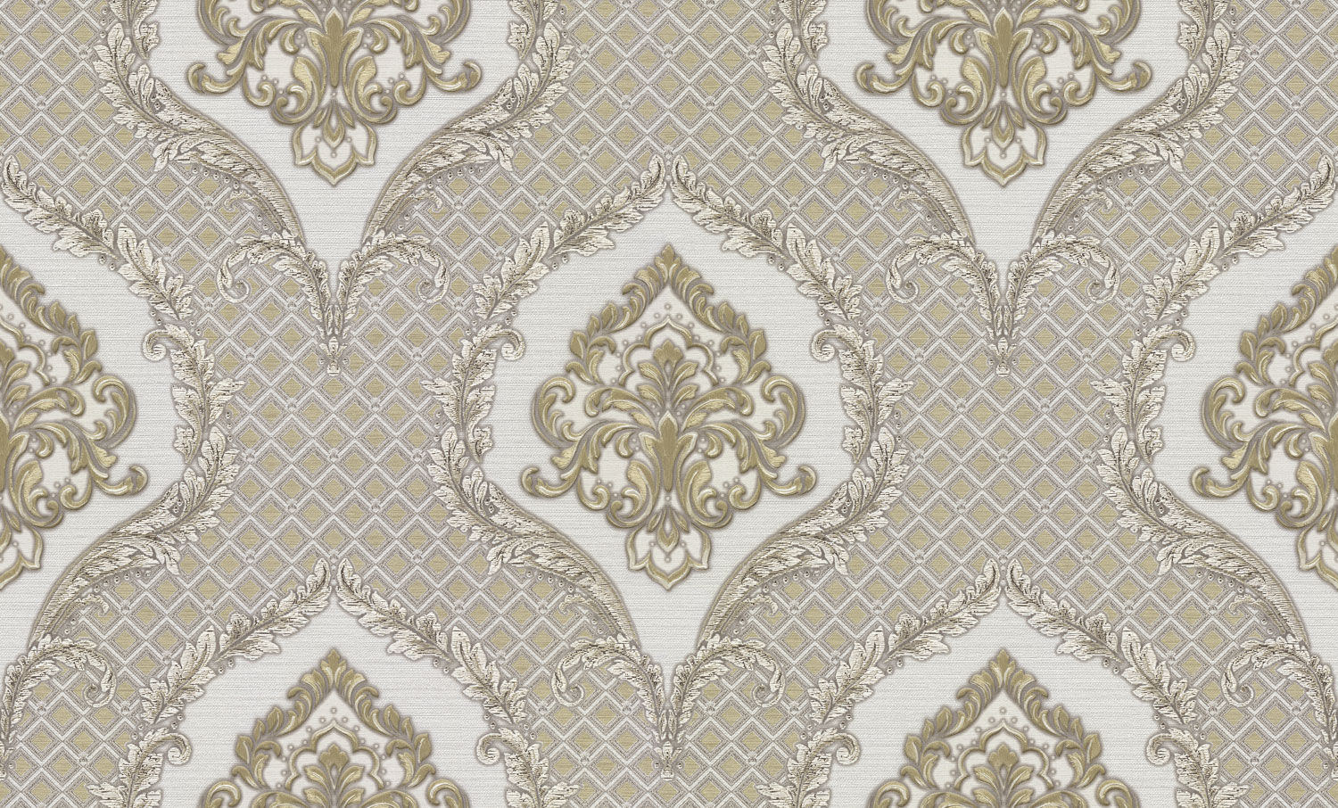Luxury metallic gold-cream baroque non-woven wallpaper with ornaments on a geometric background.