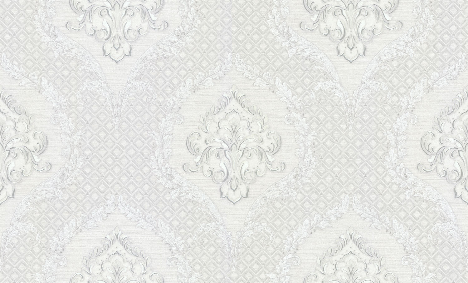 Luxury metallic white-silver baroque non-woven wallpaper with ornaments on a geometric background.