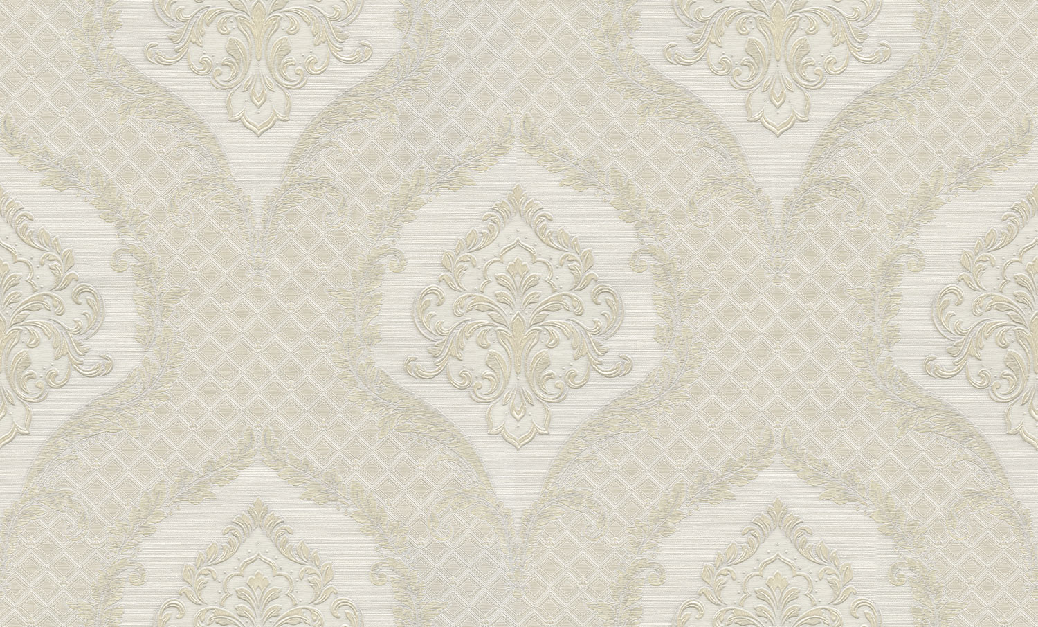 Luxury metallic white-gold baroque wallpaper with ornaments on a geometric background.