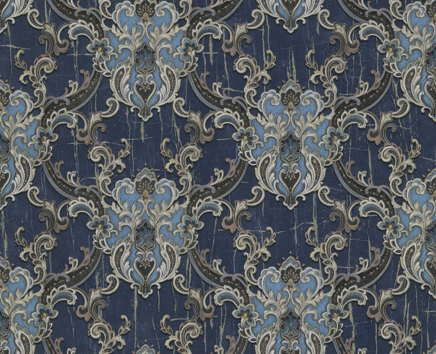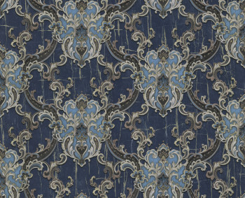 Luxury wallpaper with blue-gold baroque ornaments on a background imitating plaster.