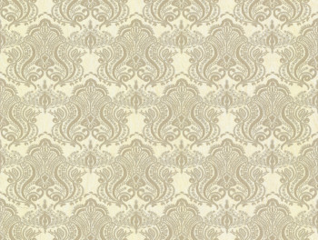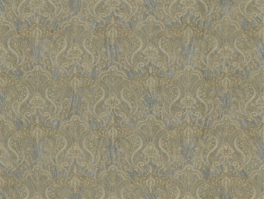 Luxury gray-gold wallpaper with a repeating baroque pattern.