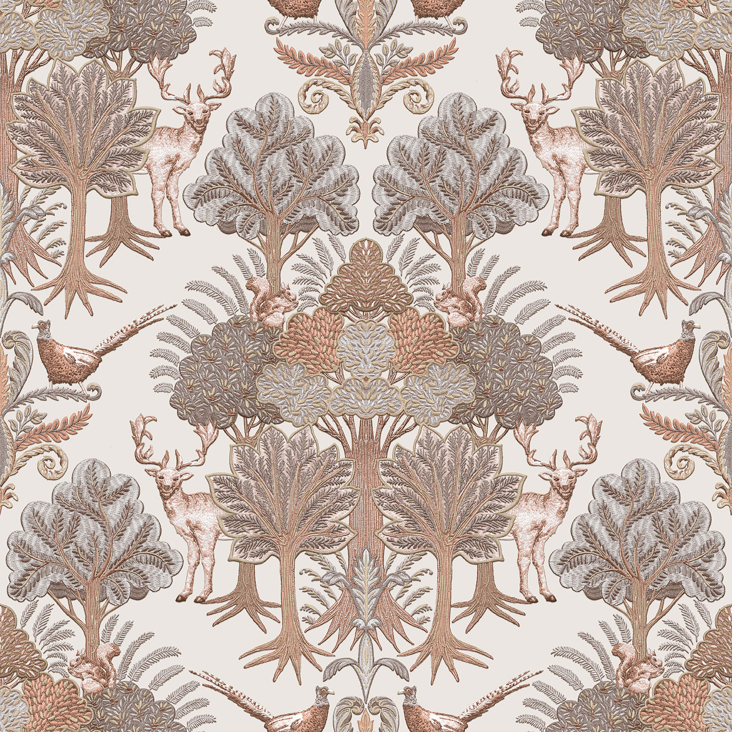 Luxury non-woven wallpaper, beige background, forest and forest animals motif in shades of grey and brown. The patterns on the wallpaper look like embroidery.