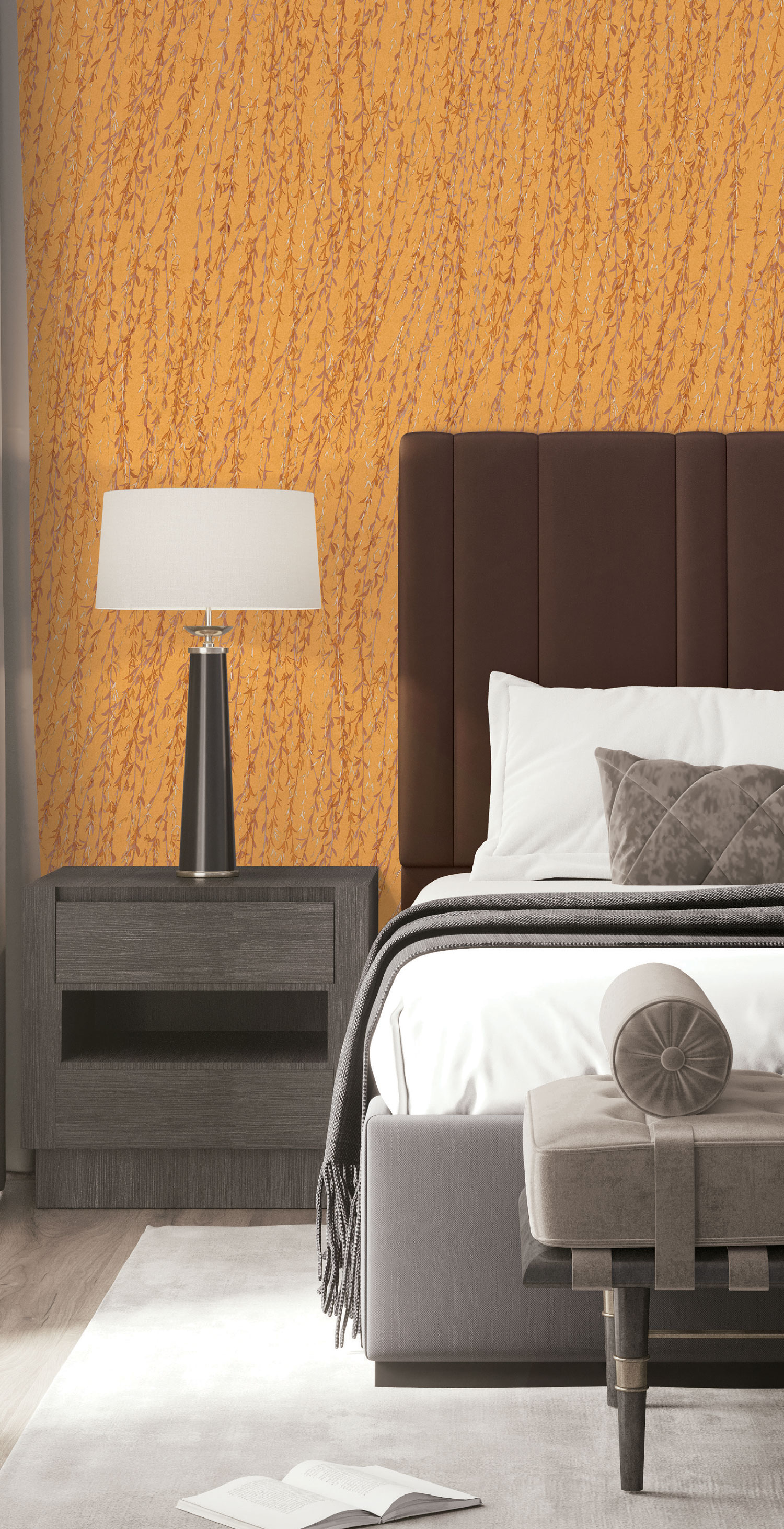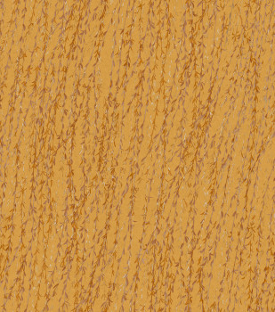 Luxury orange non-woven wallpaper with twigs and willow leaves in shades of orange and brown. Gently embossed texture of silk fabric.