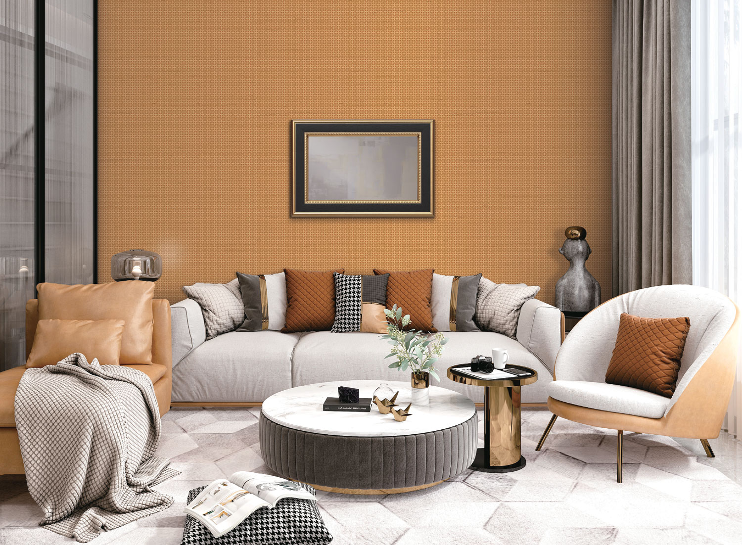 Luxury orange non-woven wallpaper, finely embossed texture of silk fabric with interwoven geometric pattern.