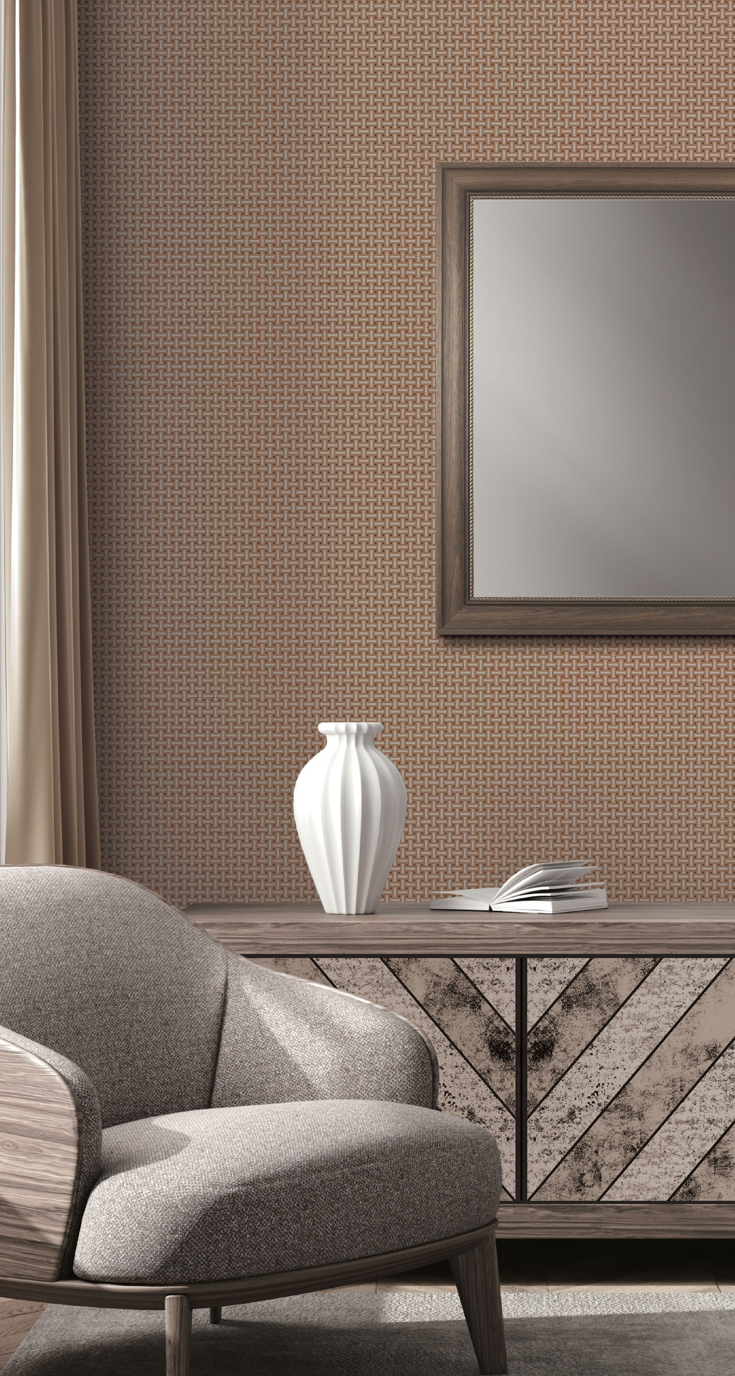 Luxury brown non-woven wallpaper, finely embossed texture of silk fabric with interwoven geometric pattern.