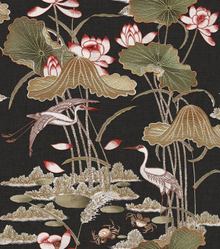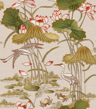 Luxury non-woven wallpaper, semi-gloss gray-green background, motif of water lilies and birds in shades of brown, red, gray and green. The patterns on the wallpaper look like embroidery.