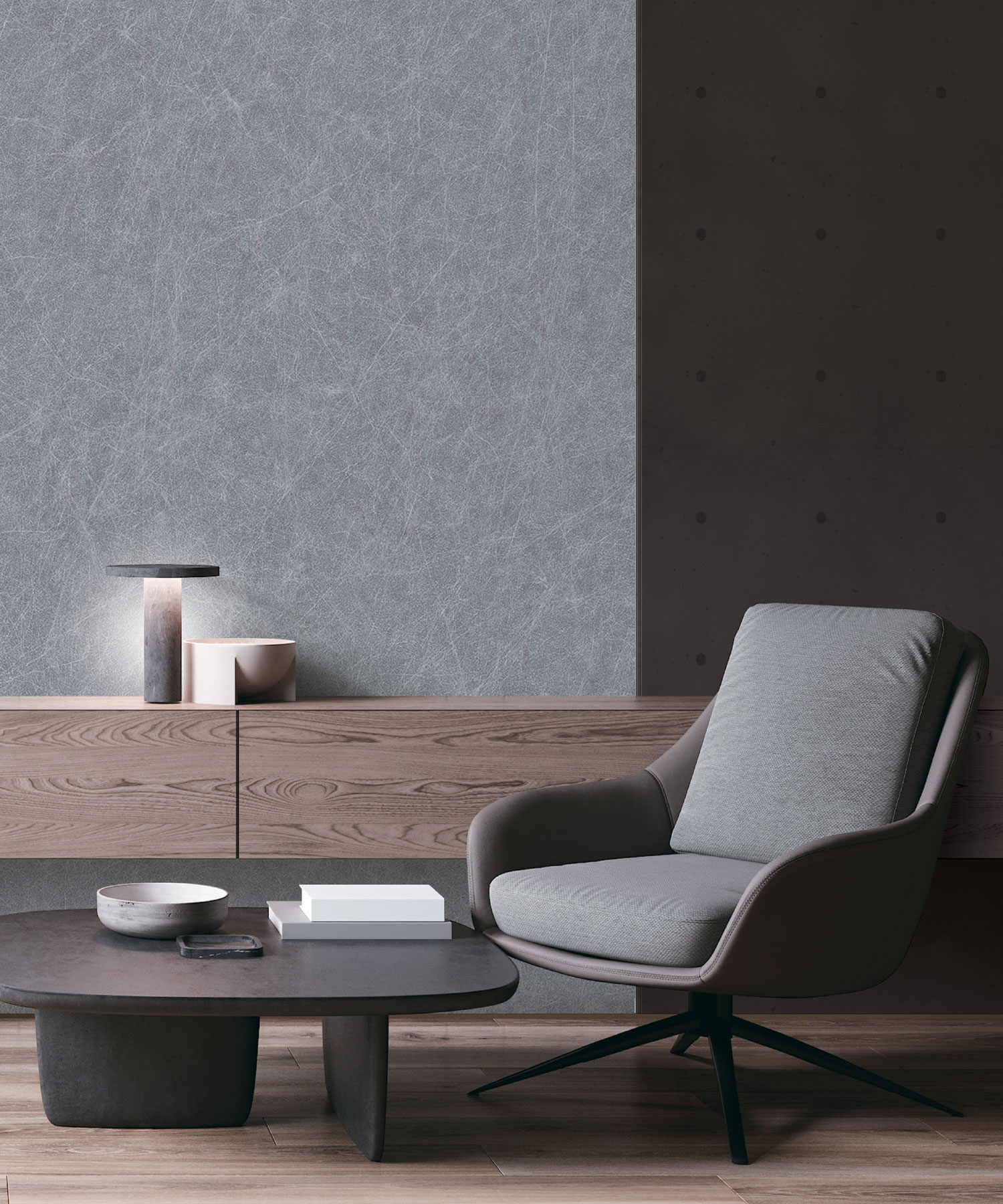 Luxury grey-blue non-woven wallpaper, finely embossed texture evoking natural material. Interior photo is for illustration only.