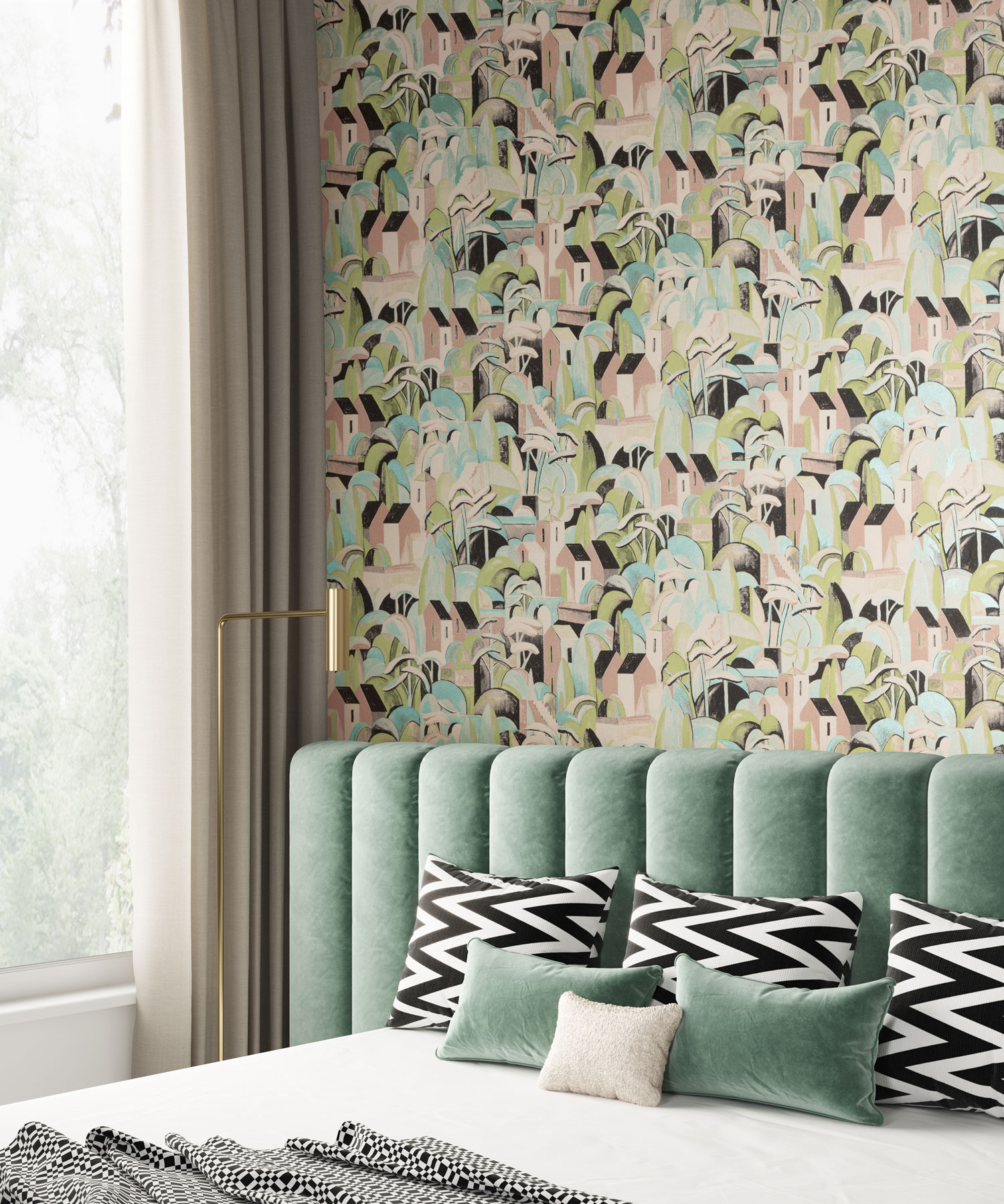 From citrus and cypress to warm, geometric fabric patterns, from vibrant color combinations to tone-on-tone wallpaper patterns. The wallpapers are inspired by southern towns and villages, which are complemented by wallpaper with faithful fabric patterns.